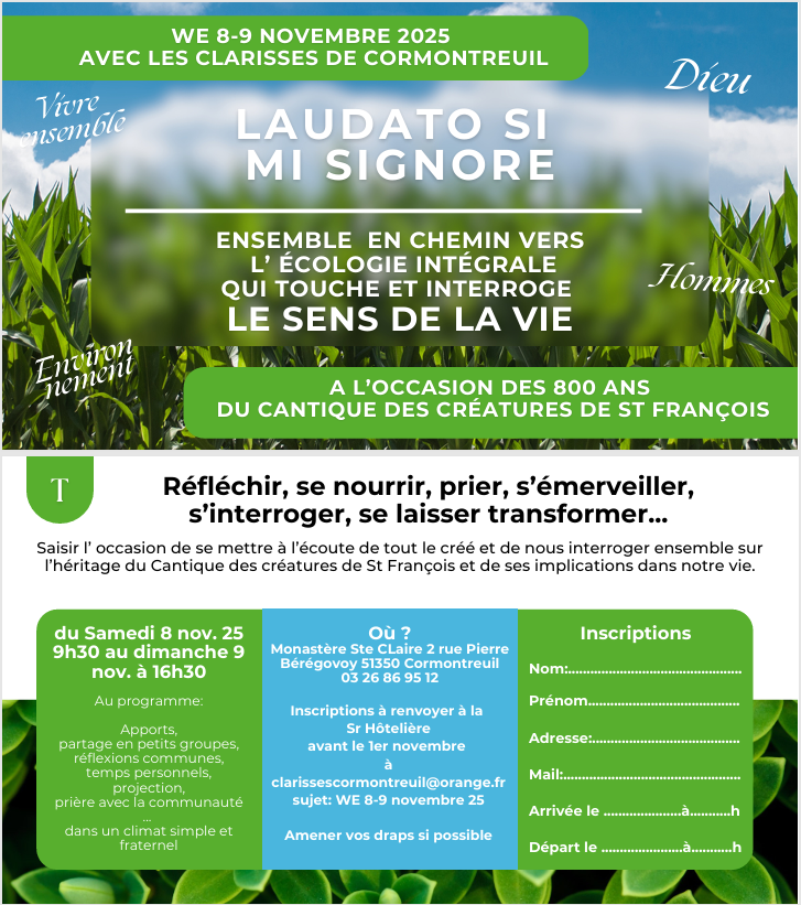 Animé par deux soeurs de la communauté, venez réfléchir, prier, se nourrir, s’émerveiller, s’interroger, se laisser transformer … par le Cantique des Créatures et les implications de l’écologie intégrale dans toutes les dimensions de notre vie. Au programme : apports, partage en petits groupes, réflexions communes, temps personnels, projection, prière avec la communauté … dans un climat simple et fraternel.