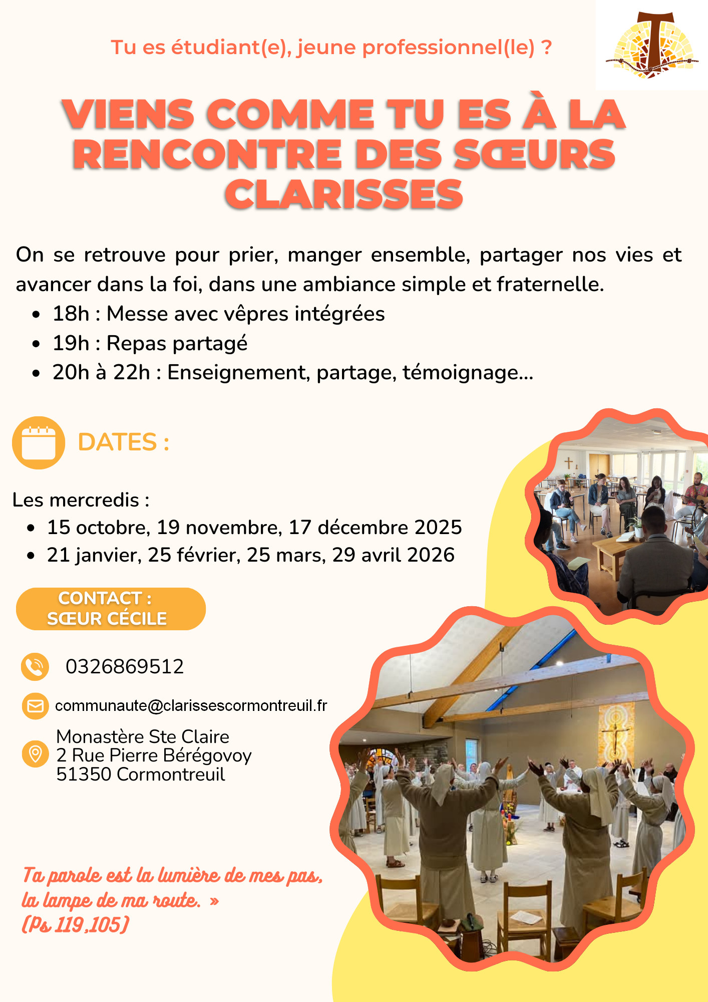 La communauté t’invite à vivre un temps fraternel et de partage avec quelques soeurs un mercredi par mois environ entre 18h et 22h.